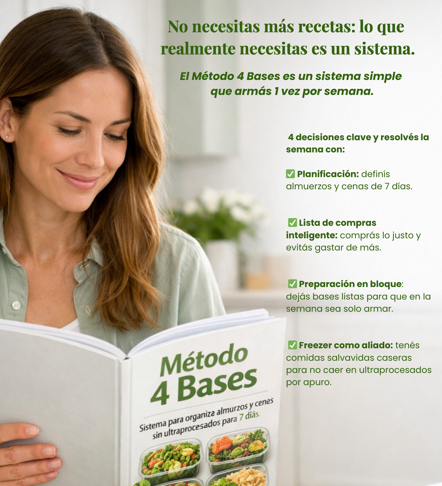 Esto es lo que necesitaba hace años. Soy mamá de mellizos y el caos era total. Con el Método 4 Bases recuperé el control de mi cocina. Ya no tiro comida, ahorro plata y todos comemos rico.