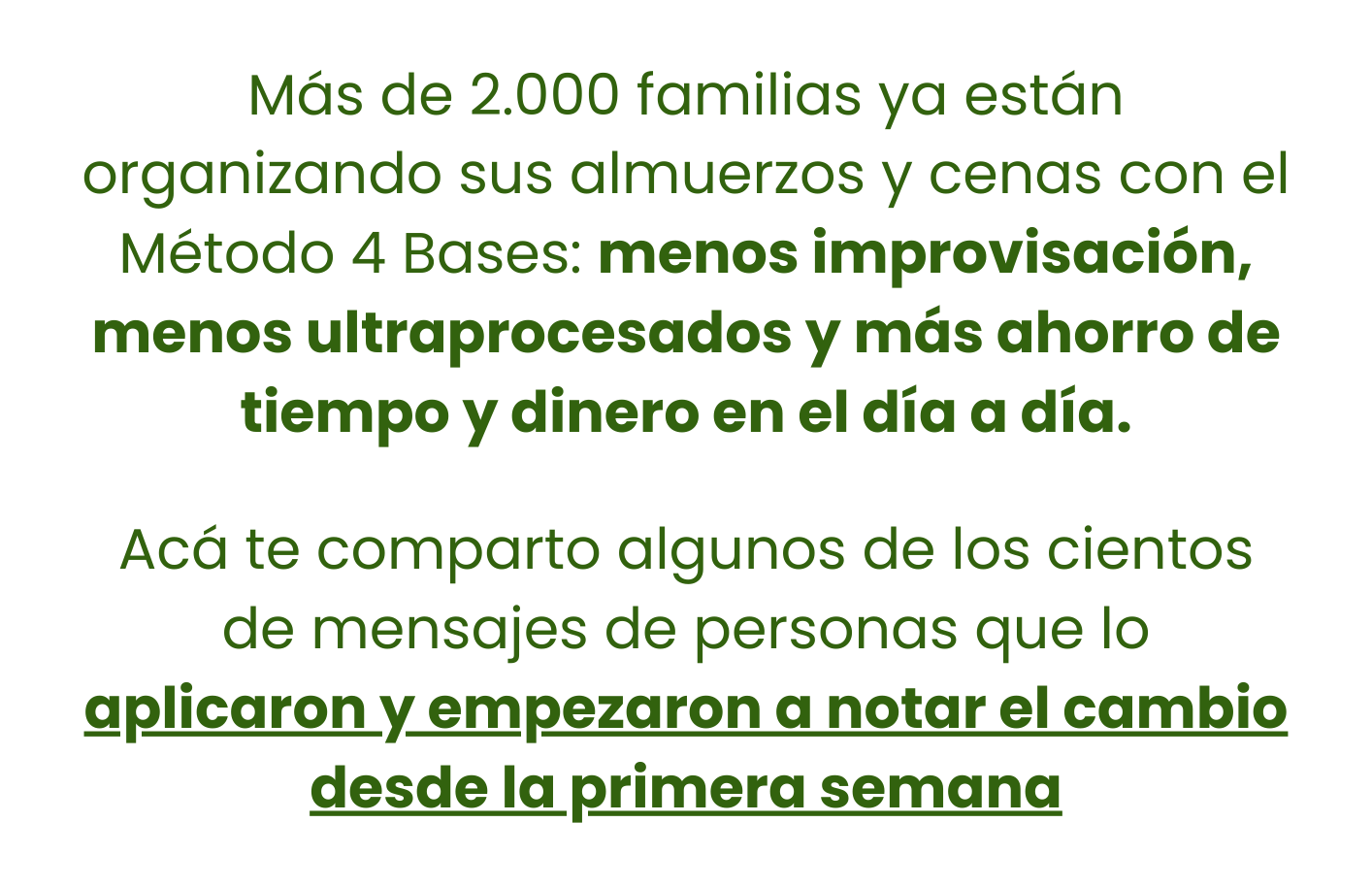 ¡Increíble! Ya no pierdo horas pensando qué cocinar. El método 4 Bases me cambió la vida. Ahora planeo toda la semana en minutos y mis chicos comen mucho más variado.
